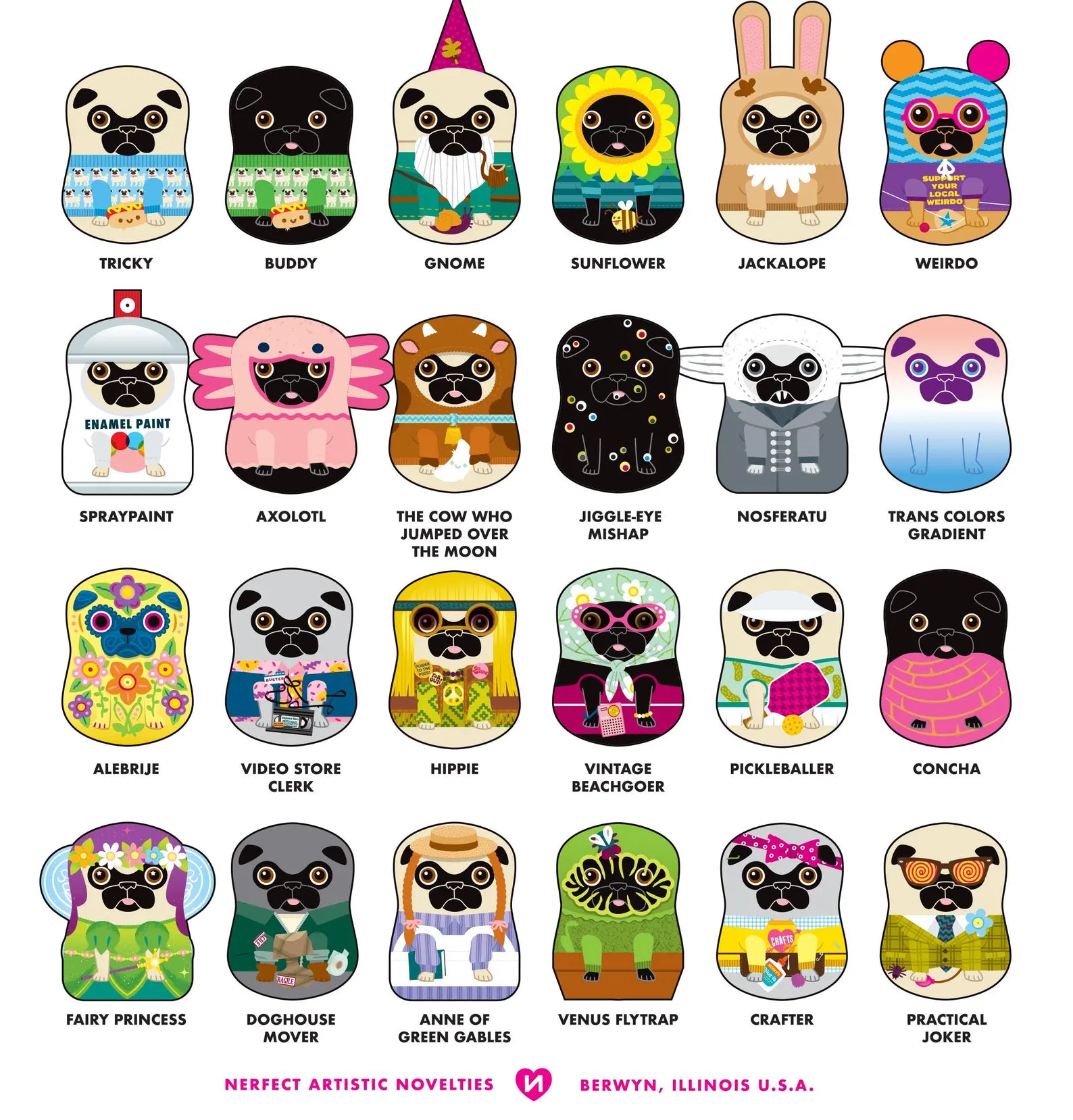 Contained in each Nerfect Pug Surprise is one of forty-five, randomly selected, pocket-sized pug character plush. To clarify, this item is sold blind-bagged, meaning that the stuffed toy has been sealed within the package, so no one knows which design you will get inside.